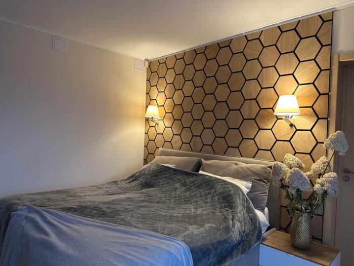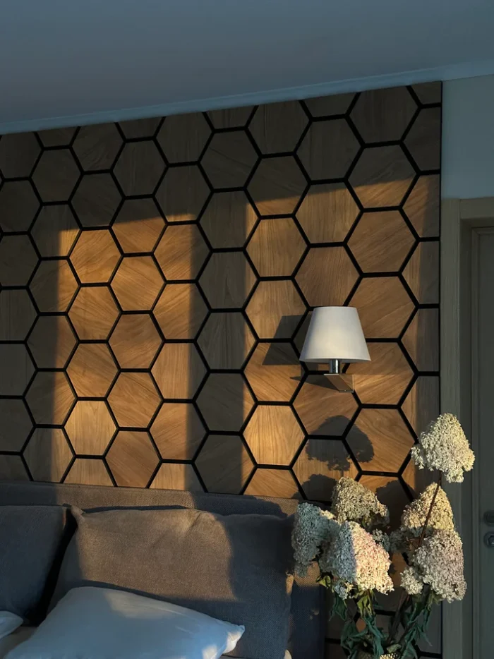 Elementi u obliku saća s površinom od drvenog furnira pružaju vizualnu privlačnost. Njihov oblik podsjeća na strukturu košnice. Djeluju i kao elementi za prigušivanje i kao vizualni privlačeći pogled, što ih čini odličnim izborom i za javne prostore i za kuće. Dostupno je nekoliko različitih boja, tako da se paneli mogu lako prilagoditi individualnom stilu prostora.