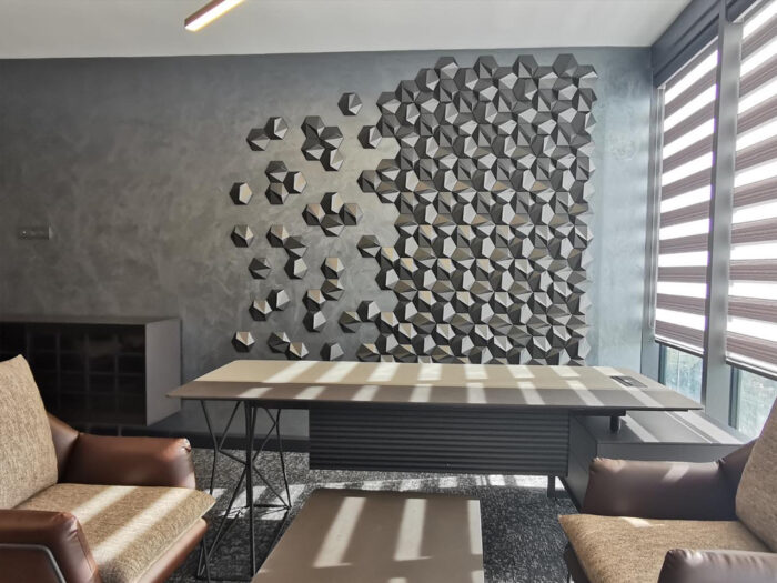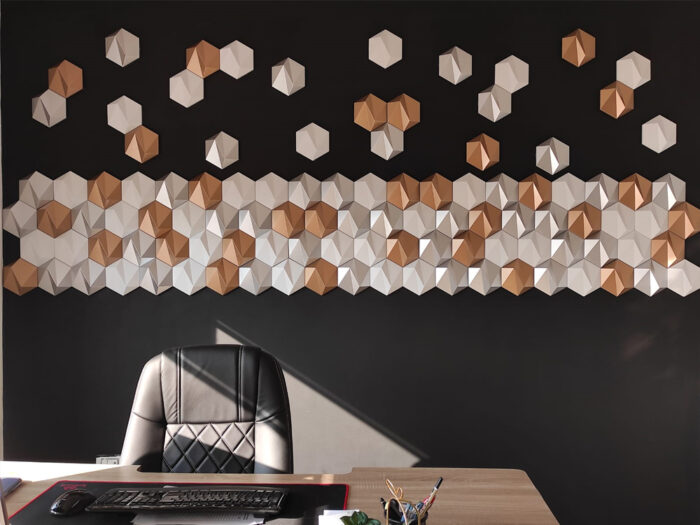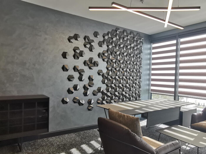 Oštre linije ZETA zidnog panela omogućava da svjetlost napravi čaroban izgled u obliku saća. Vizuelna poezija nijansi je idealno rješenje za transformaciju dosadnih zidova u moderno dizajnirane sto vam model Zeta pruža.